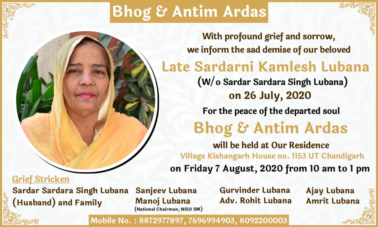 BHOG ANTIM ARDAS With profound grief and sorrow we inform the sad demise of our beloved Kuldeep Kour Do Late Bija Singh Ro Railway Patri New Basti Bhanteen Tali Morh Miran Sahib RS Pura. My moms Bhog Antim Ardas was supposed to be on the thirteenth day tehranviHowever that happened to be on Monday the 21st Aug and I thought of the convenience of family and friends and had it on Sunday the 20th Aug. 3 May2021 Nu Guru De Charna Vich Viraj Chuke Han.